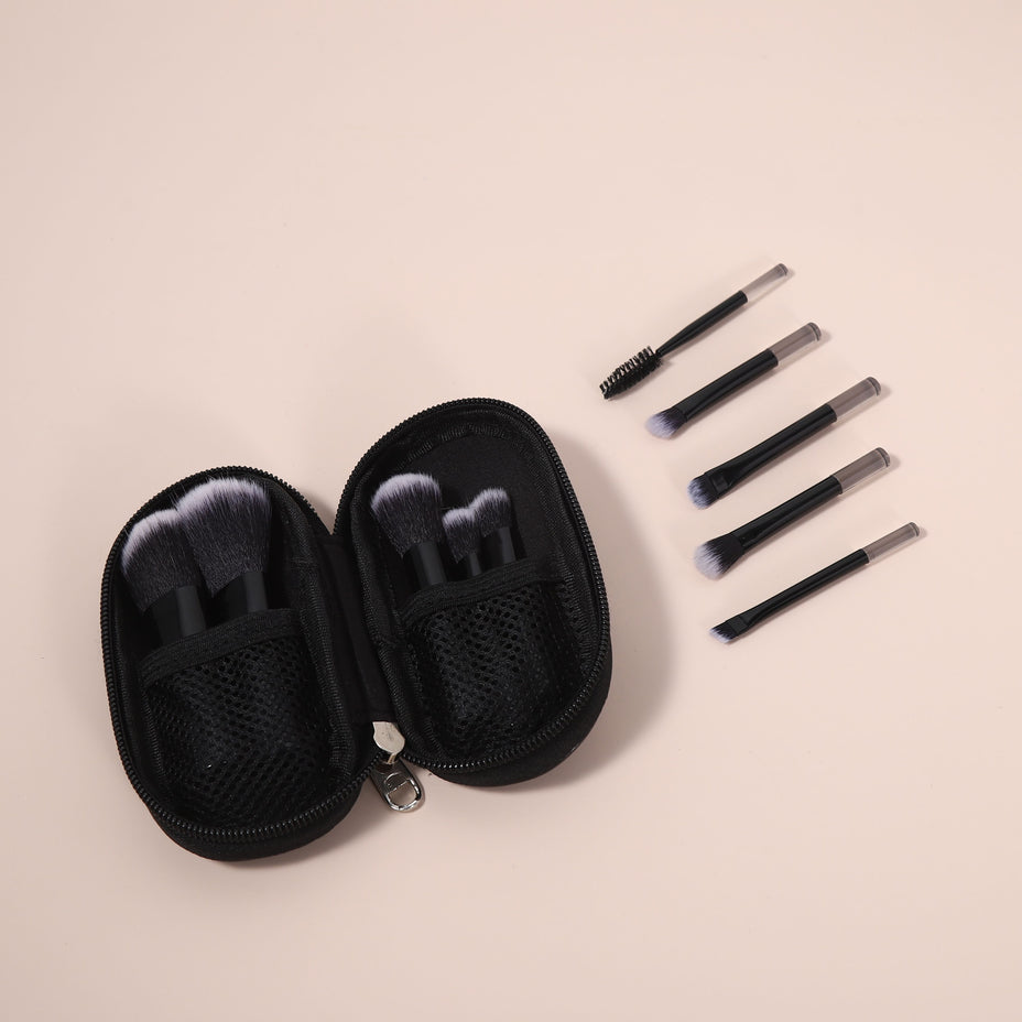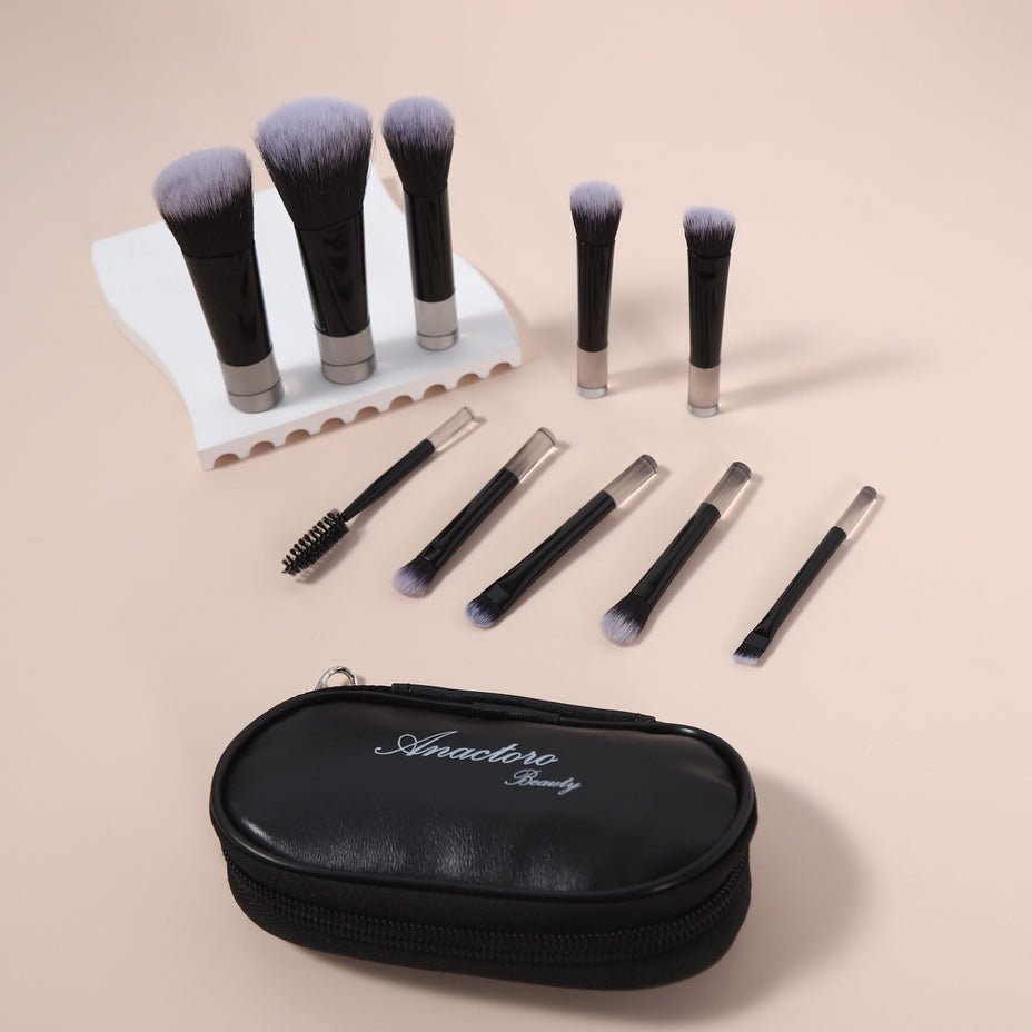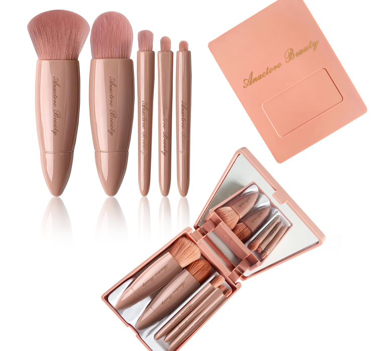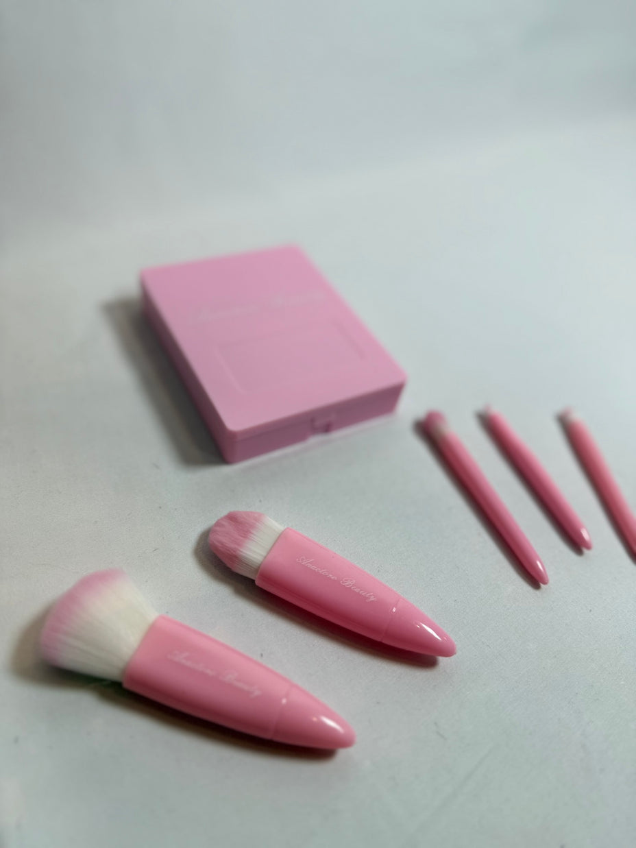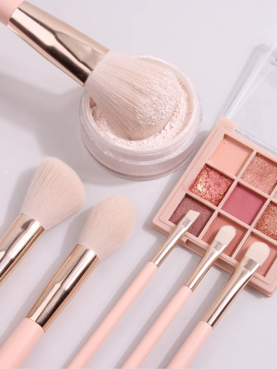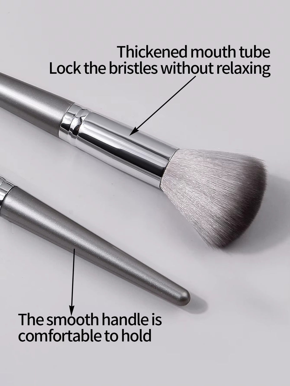 The brush set features soft, portable tools designed for precise application of foundation, blush, eyeshadow, and contouring.